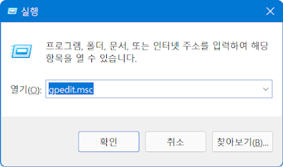 작업이 완료된 후 윈도우키와 R키를 동시에 눌러 실행창을 띄우고 gpedit.msc를 입력하고 엔터키를 치면